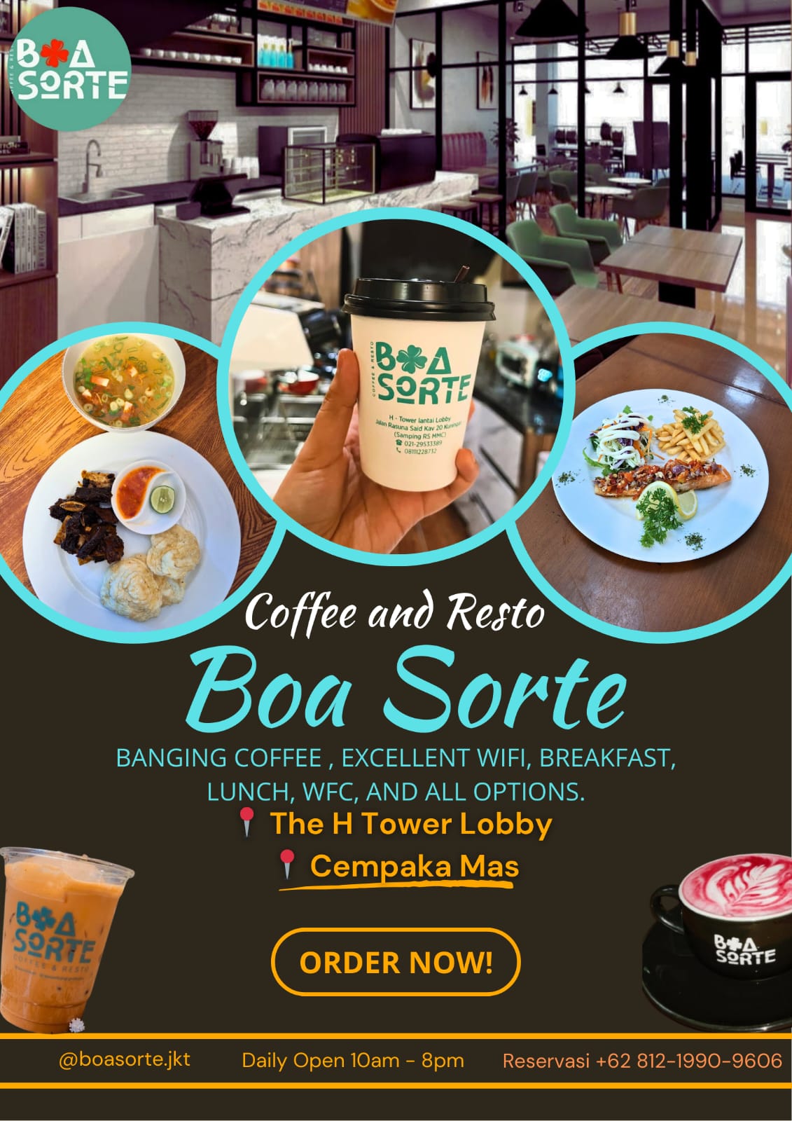 Buat kamu yang lagi nyari spot kece buat nongkrong, meeting santai, atau sekadar ngopi sambil kerja, Boa Sorte Coffee & Resto bisa jadi pilihan yang pas. Berlokasi di The H Tower Lobby dan juga ada cabang di Cempaka Mas, kafe ini menawarkan suasana nyaman dengan konsep modern yang bikin betah berlama-lama.
