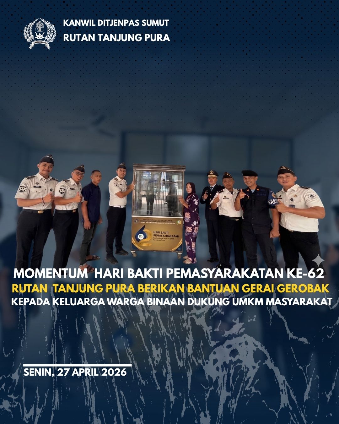 Rumah Tahanan Negara (Rutan) Kelas IIB Tanjung Pura melaksanakan kegiatan penyerahan gerai gerobak usaha kepada keluarga warga binaan yang berprofesi sebagai penjual makanan, untuk mendorong kemandirian ekonomi keluarga warga binaan.Kegiatan ini diselenggarakan dalam rangka memperingati Hari Bakti Pemasyarakatan ke-62 Kementerian Imigrasi dan Pemasyarakatan Republik Indonesia sebagai bentuk nyata kepedulian institusi pemasyarakatan terhadap kesejahteraan sosial dan ekonomi masyarakat, khususnya keluarga warga binaan.Senin (27/04).